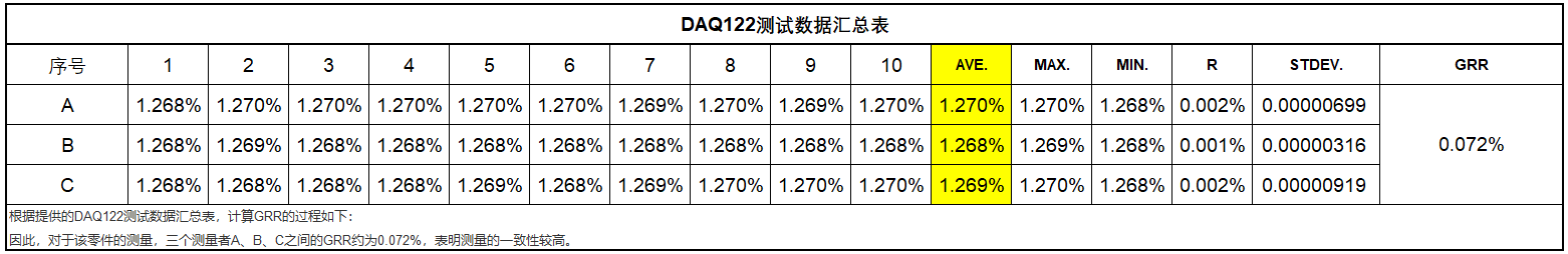 Um sicherzustellen, dass die ausgewählte Datenerfassungskarte den Anforderungen entspricht, hat das ME-Team sie getestet. Die Analyse zeigt, dass die ausgewählte Datenerfassungskarte eine hervorragende Stabilität mit einem GRR von etwa 0,072 % bei den drei Messgeräten A, B und C aufweist.