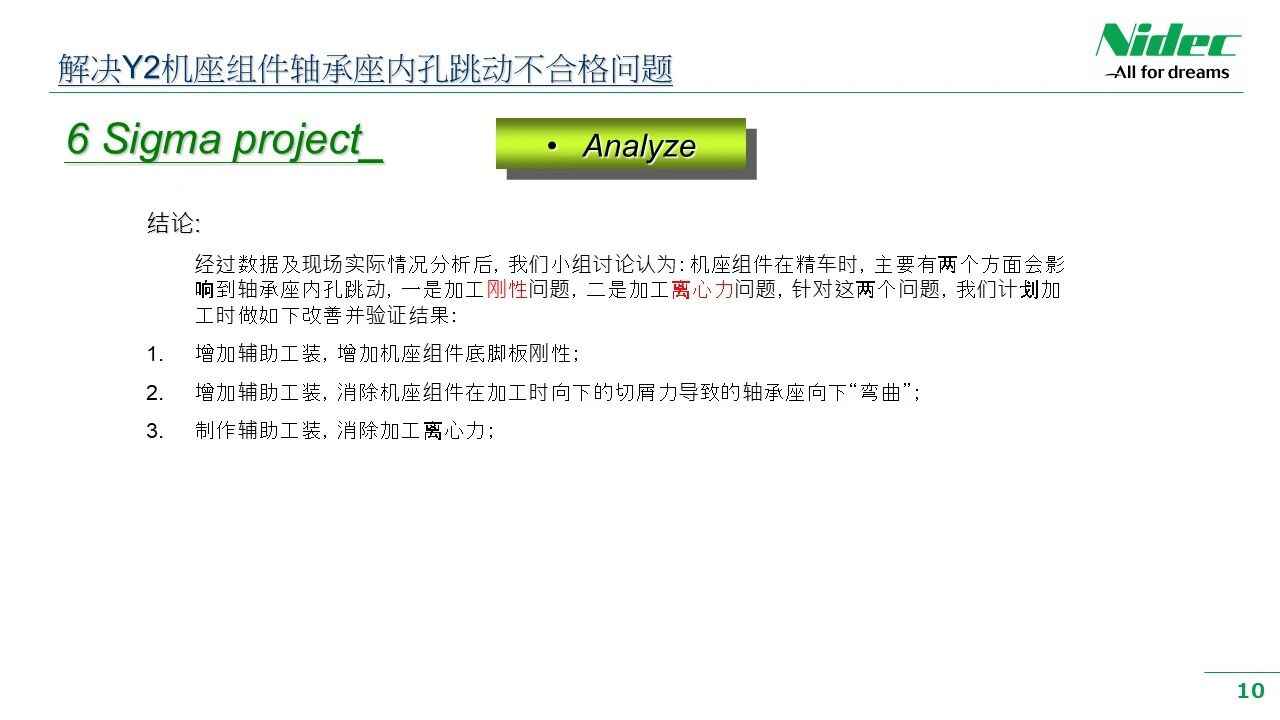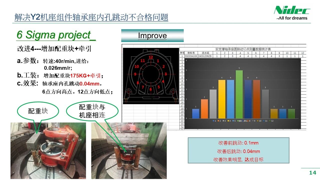 Im Einklang mit der Qualitätspolitik und der Managementphilosophie des Unternehmens „Sich selbst zufriedenstellen, Kunden zufrieden stellen, ehrlich und vertrauenswürdig sein und nach Exzellenz streben“ versorgen wir unsere Kunden kontinuierlich mit Produkten höherer Kosteneffizienz und stabilerer Qualität. In der Bearbeitungswerkstatt kam es kürzlich zu einem Phänomen, bei dem die Schlüsselabmessungen oder geometrischen Toleranzen einiger Schlüsselprozesse nach der Bearbeitung instabil waren und die 6-Sigma-Steuerungsanforderungen nicht erfüllten. Darauf legt die Unternehmensleitung großen Wert und hat die Werkstatt zur Einrichtung einer Arbeitsgruppe zur Werkstattqualitätsverbesserung angeregt. Diese Task Force besteht aus Leitern relevanter Abteilungen, relevanten Ingenieuren, Teamleitern und Mitarbeitern an vorderster Front in der Produktion. Durch den Einsatz der DMAIC-Methode der 6-Sigma-Verbesserung wurde eine umfassende Qualitätsverbesserungskampagne gestartet. Durch eine Reihe von Verbesserungsaktivitäten wie Hintergrunduntersuchungen, Datenerfassung, Problemzusammenfassung, Ursachenanalyse und Formulierung kurz- und langfristiger Verbesserungsmaßnahmen wurde die Qualitätsverbesserungsarbeit vollständig durchgeführt. Diese Verbesserungsaktivität hat die praktische Fähigkeit von Basismanagern und Mitarbeitern umfassend verbessert, die 6-Sigma-Verbesserungstools parallel zu verstehen, anzuwenden und zu fördern. Es trägt dazu bei, die Schwankungen und Schwankungen der Qualitätsmerkmale bearbeiteter Teile zu reduzieren, wodurch die Fertigungsqualität von Motoren insgesamt verbessert wird und Kunden qualitativ hochwertigere Produkte bereitgestellt werden können.