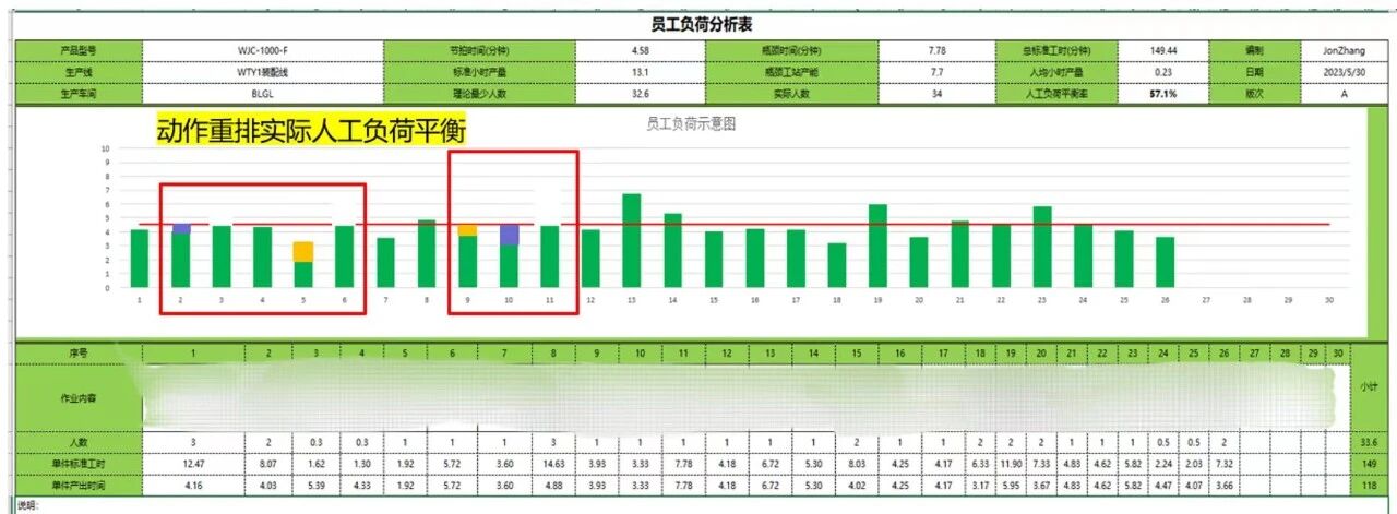 Die Arbeitsbelastung der Mitarbeiter ist ein grundlegendes Element bei der Kapazitätsverbesserung. Aufgrund inkonsistenter Zykluszeiten zwischen den Prozessen war die tatsächliche Leistung relativ gering. Die ME-Abteilung nutzte die Erfahrungen aus früheren Verbesserungen der Linienverteilung und übernahm die Führung bei der Förderung von Initiativen zur Verbesserung der Arbeitsbelastungsverteilung der Mitarbeiter in der Produktionslinie. Durch die Anwendung des ECRS-Prinzips (Eliminate, Combine, Rearrange, Simplify) zur Prozessoptimierung erreichte die Auslastungsquote der Mitarbeiter über 82 %.